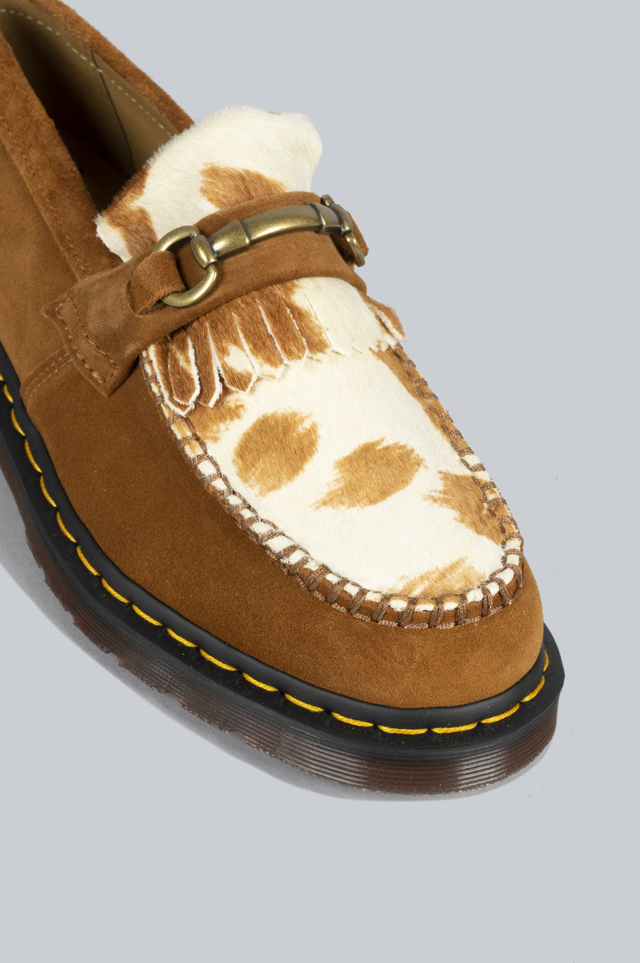 Dr. Martens' Adrian Snaffle loafer comes restitched with Repello Calf suede and cow print hair. Also detailed with gold snaffle and is seated on a grooved outsole.