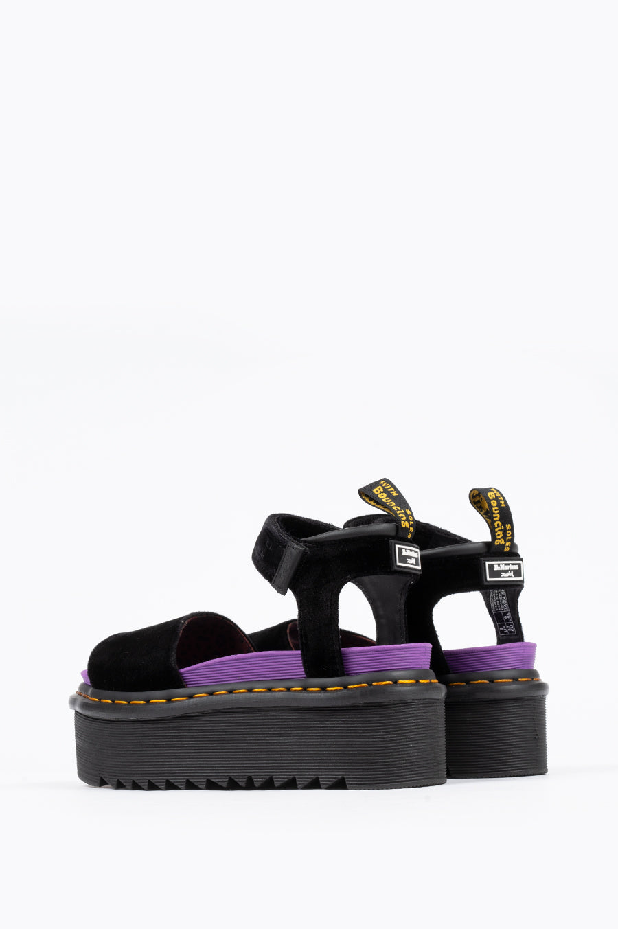 X-Girl teams up Dr. Martens yet again to bring their take on the Strap Sandal. Using the the Strap Platform Sandal as their base, X-Girl keeps the Quad Sole as well as their signature yellow stitching. X-Girl replaces the usual leather with a black velvet and changes the ankle strap to a more elegant strap to fit their stylish vision.
